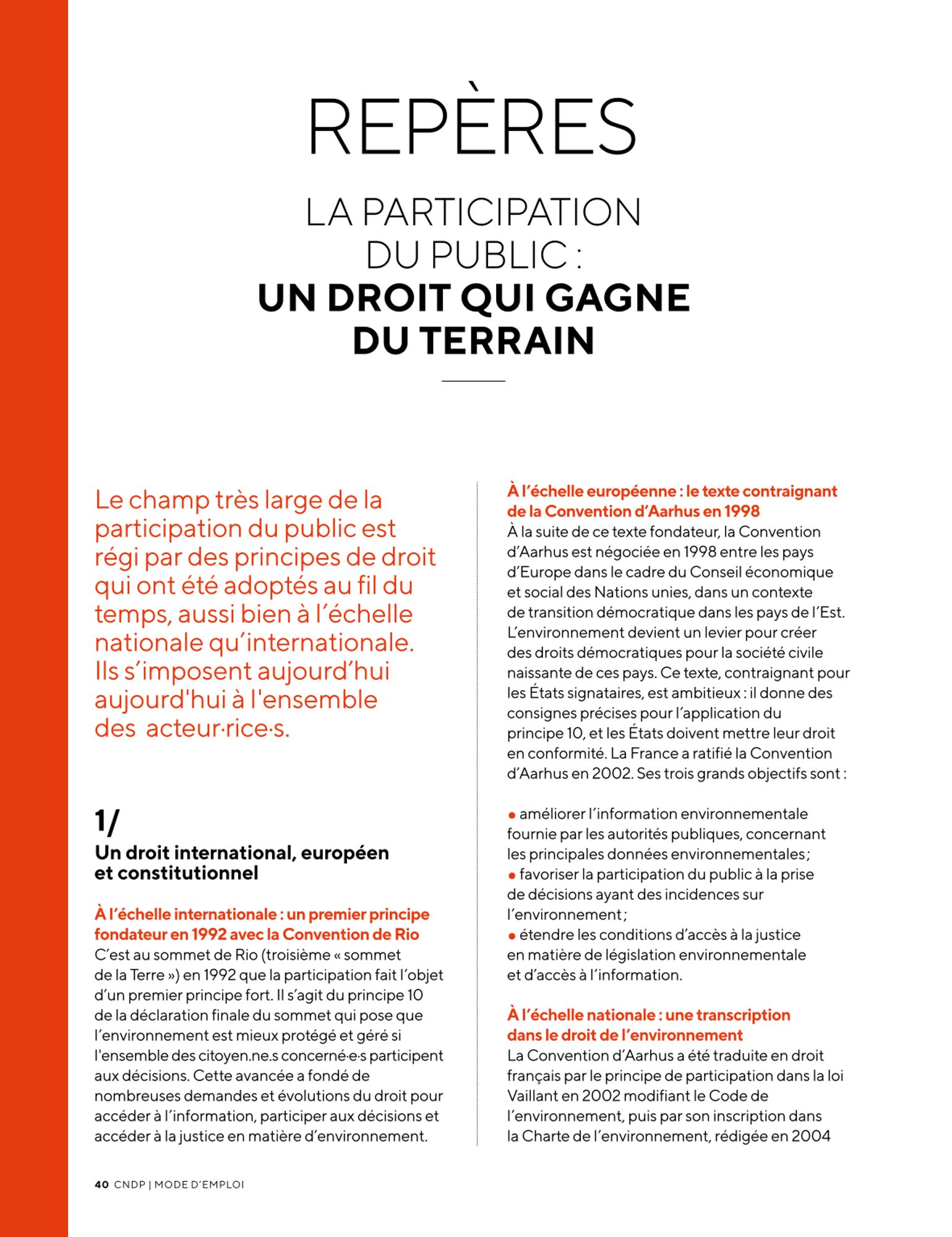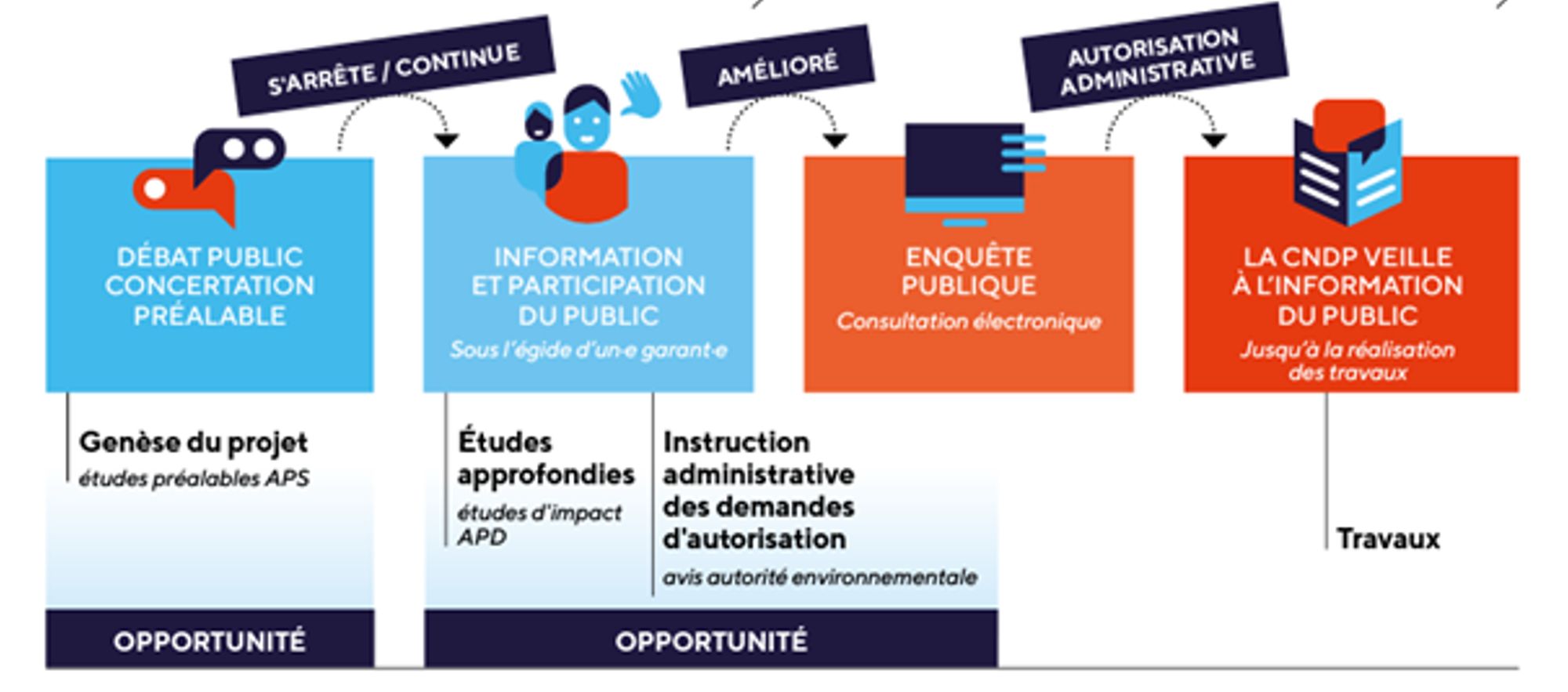 La participation garantie par la CNDP intervient dès l’origine d’un projet jusqu’à l’enquête publique, donc pendant son élaboration. Elle intervient dès l’origine, à un moment où il est encore possible d’y renoncer, de le modifier, où l’on peut interroger le “pourquoi ?” et pas seulement le “comment ?”. Si après cette première phase, le porteur de projet décide de le poursuivre, la loi prévoit que la CNDP veille à l’information et à la participation du public jusqu’à l‘enquête publique.