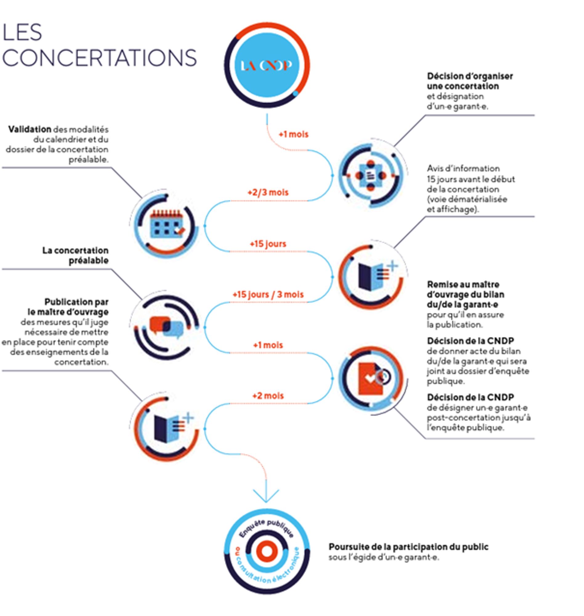 A l’issue d’un débat public, ou d’une concertation pour les projets définis par la loi, la CNDP désigne un(e) ou des garant(e)s qui veilleront au droit à l’information et à la participation du public jusqu’à l’enquête publique (ou la participation par voie électronique). Elle garantit donc une concertation continue.