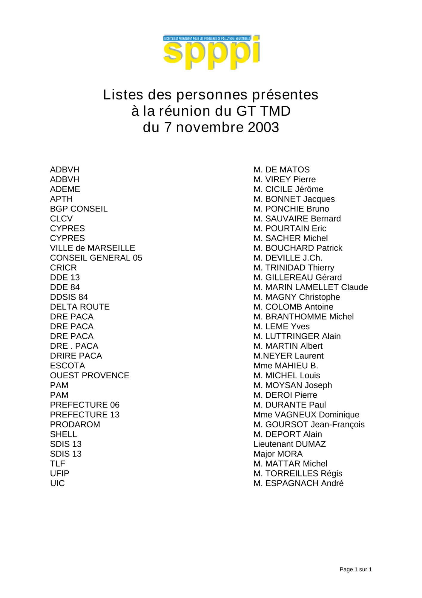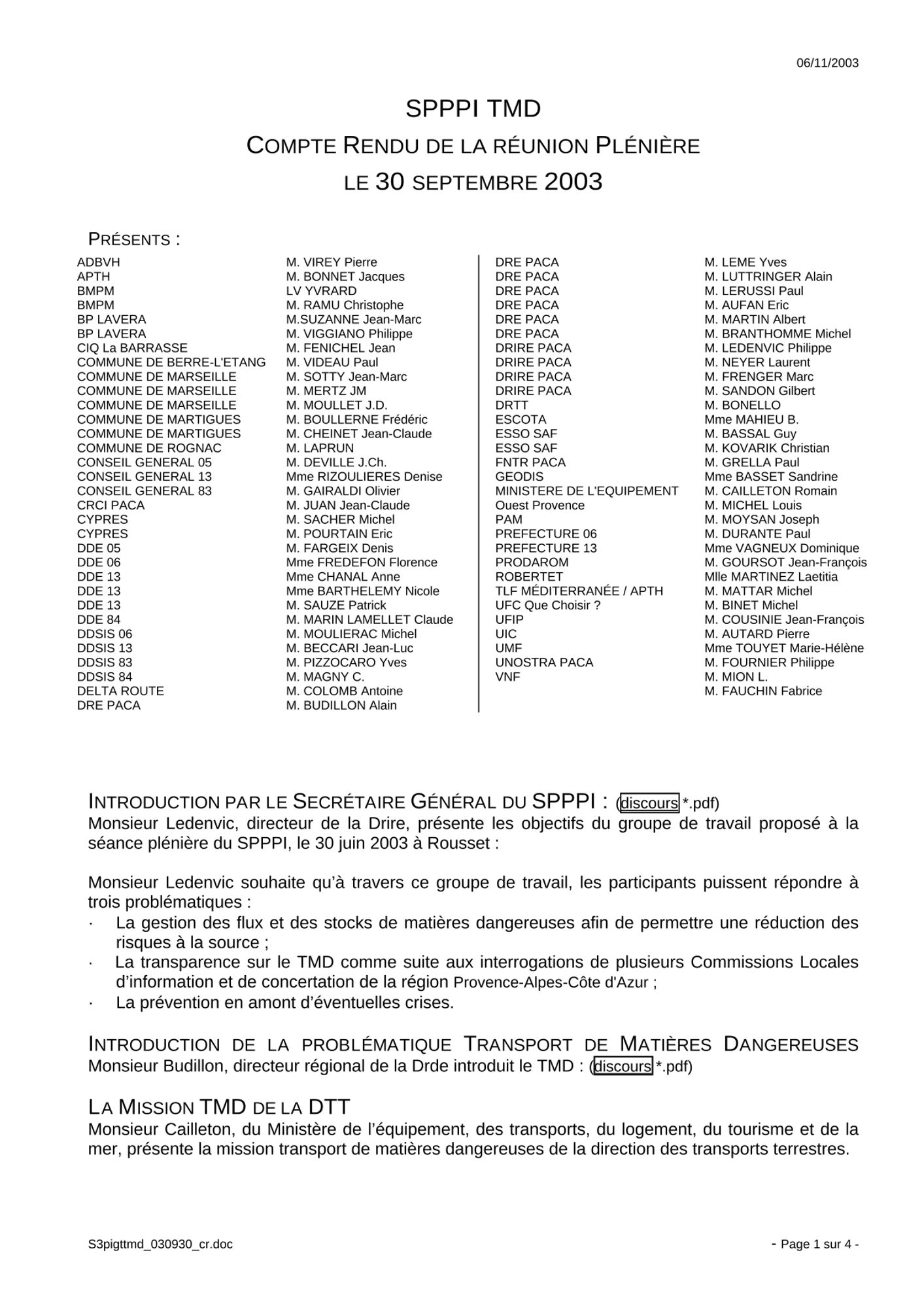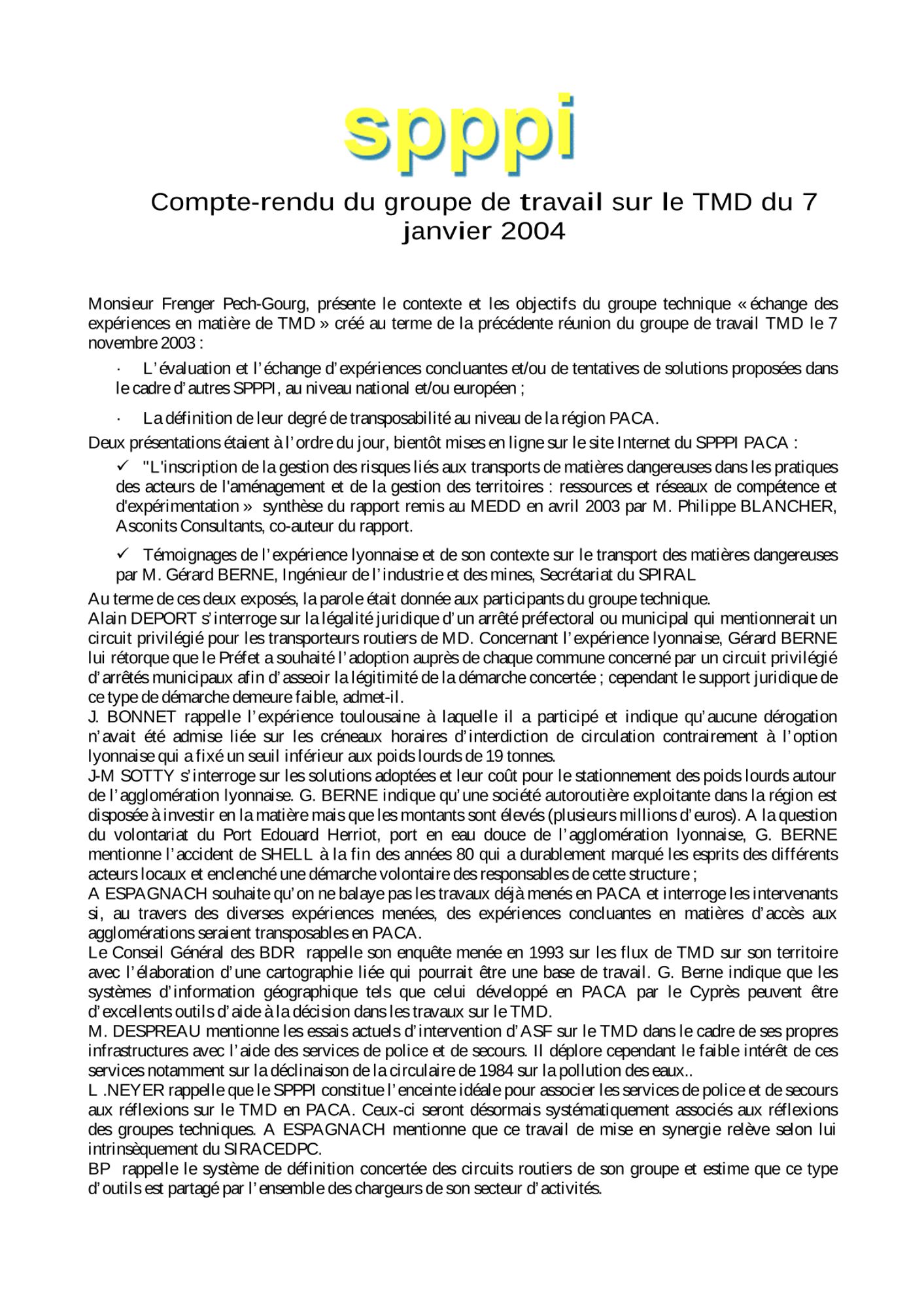 Comptes rendus et relevés de décision 2003 CR et RD_Liste des personnes présentes à la réunion du GT TMD_07/11/2003 (21.7 Ko) CR et RD_SPPPI TMD_30/09/2003 (35.8 Ko) CR et RD_Groupe de Travail sur le TMD_30/06/2003 (25.4 Ko)