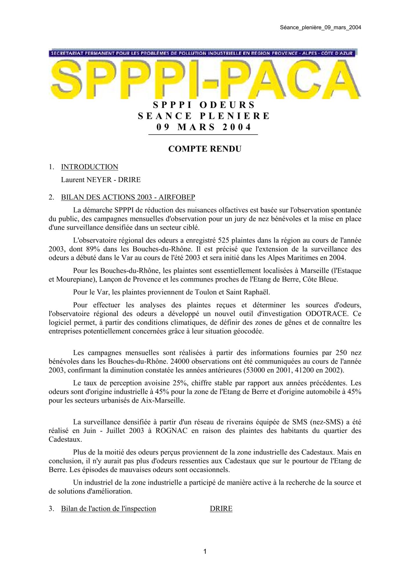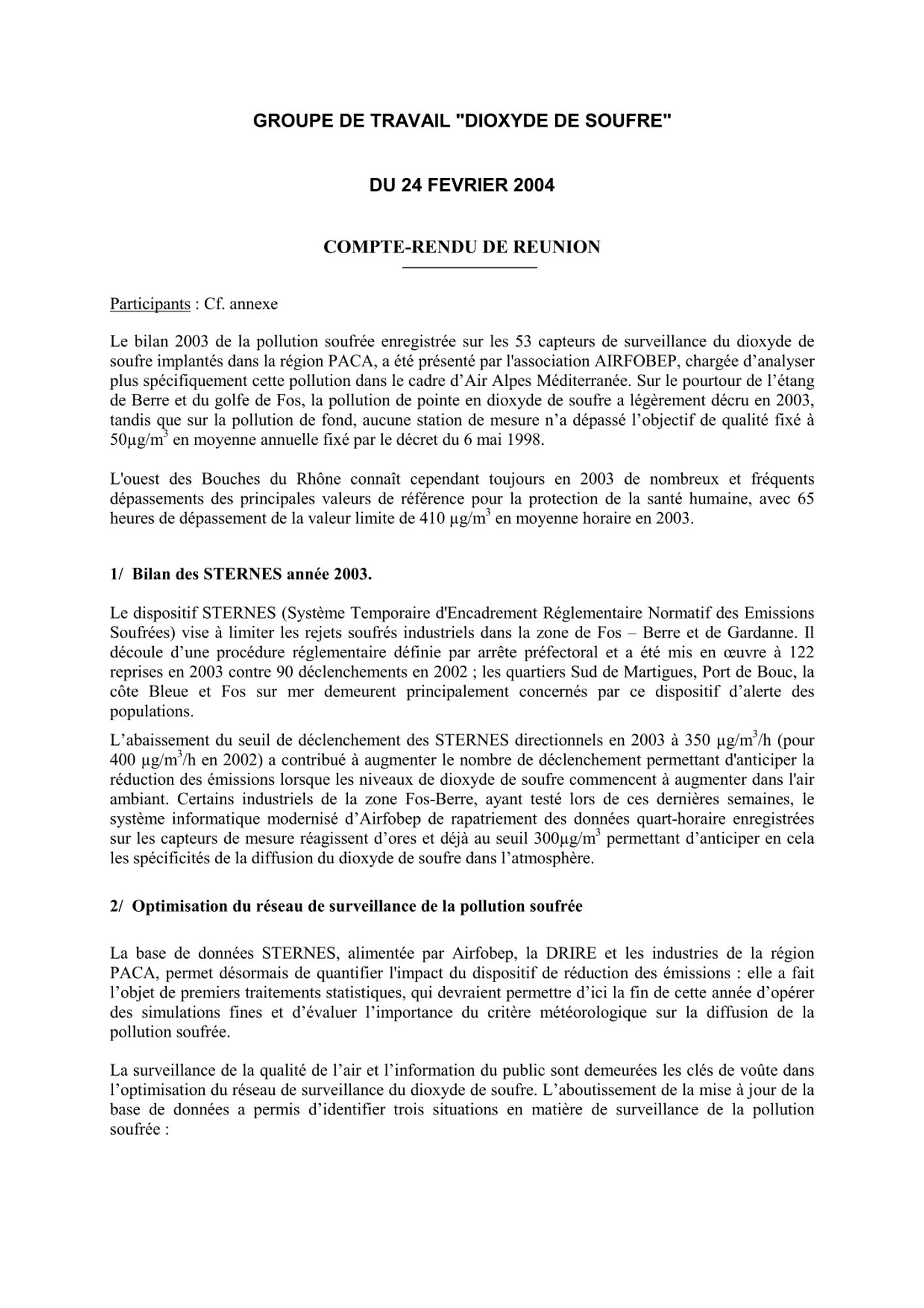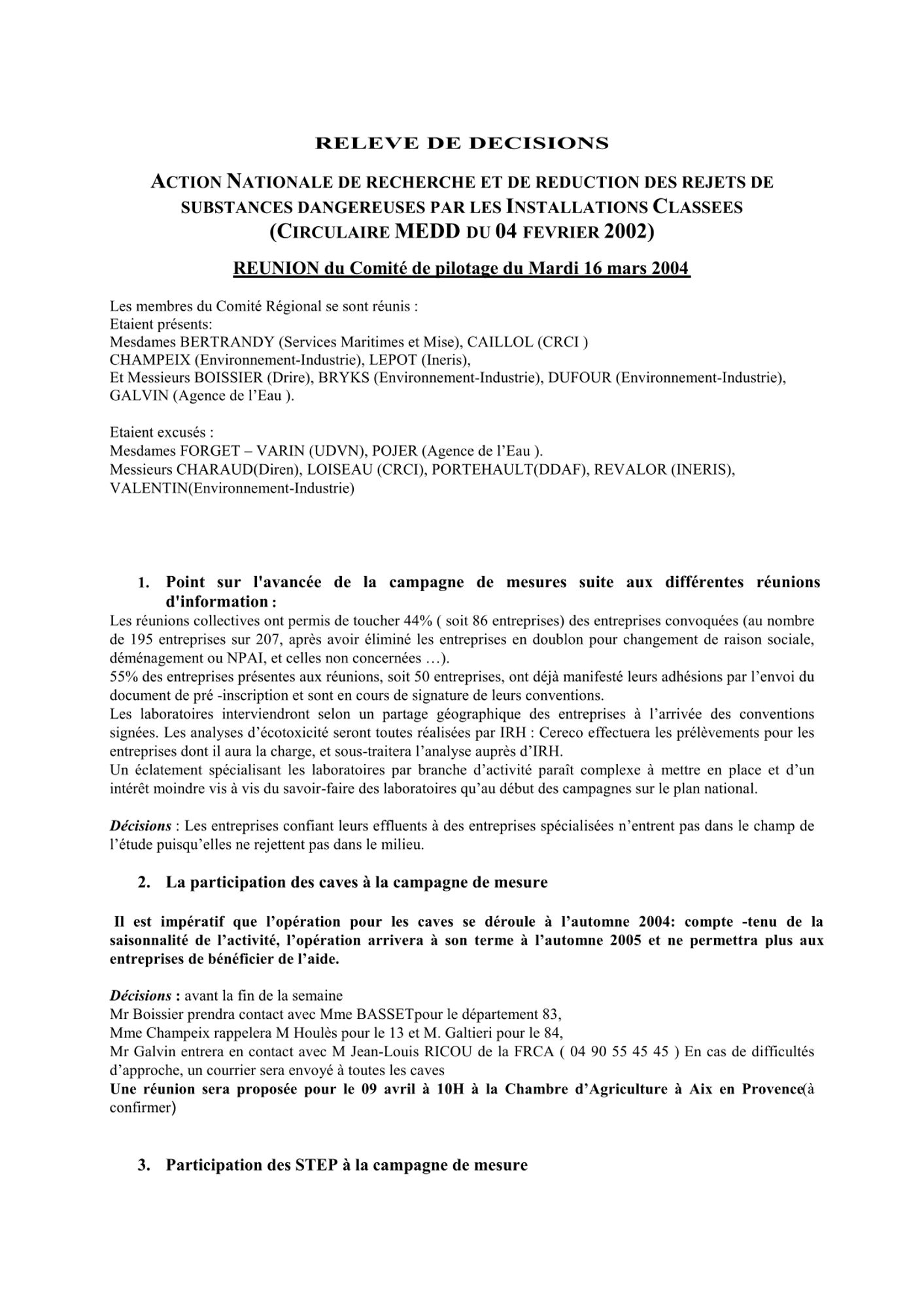 Comptes rendus et relevés de décision 2004 de janvier à mars CR et RD_Action Nationale de recherche et de réduction des rejets de substances dangereuses_16/03/2004 (53.5 Ko) CR et RD_SPPPI - Odeurs - Séance plénière_09/03/2004 (98.5 Ko) CR et RD_GT Dioxyde de soufre_24/02/2004 (340.9 Ko) CR et RD_Echange d'expériences européennes, nationales et locales de TMD_07/01/2004 (25.4 Ko) CR et RD_GT sur le TMD_07/01/2004 (25.4 Ko)