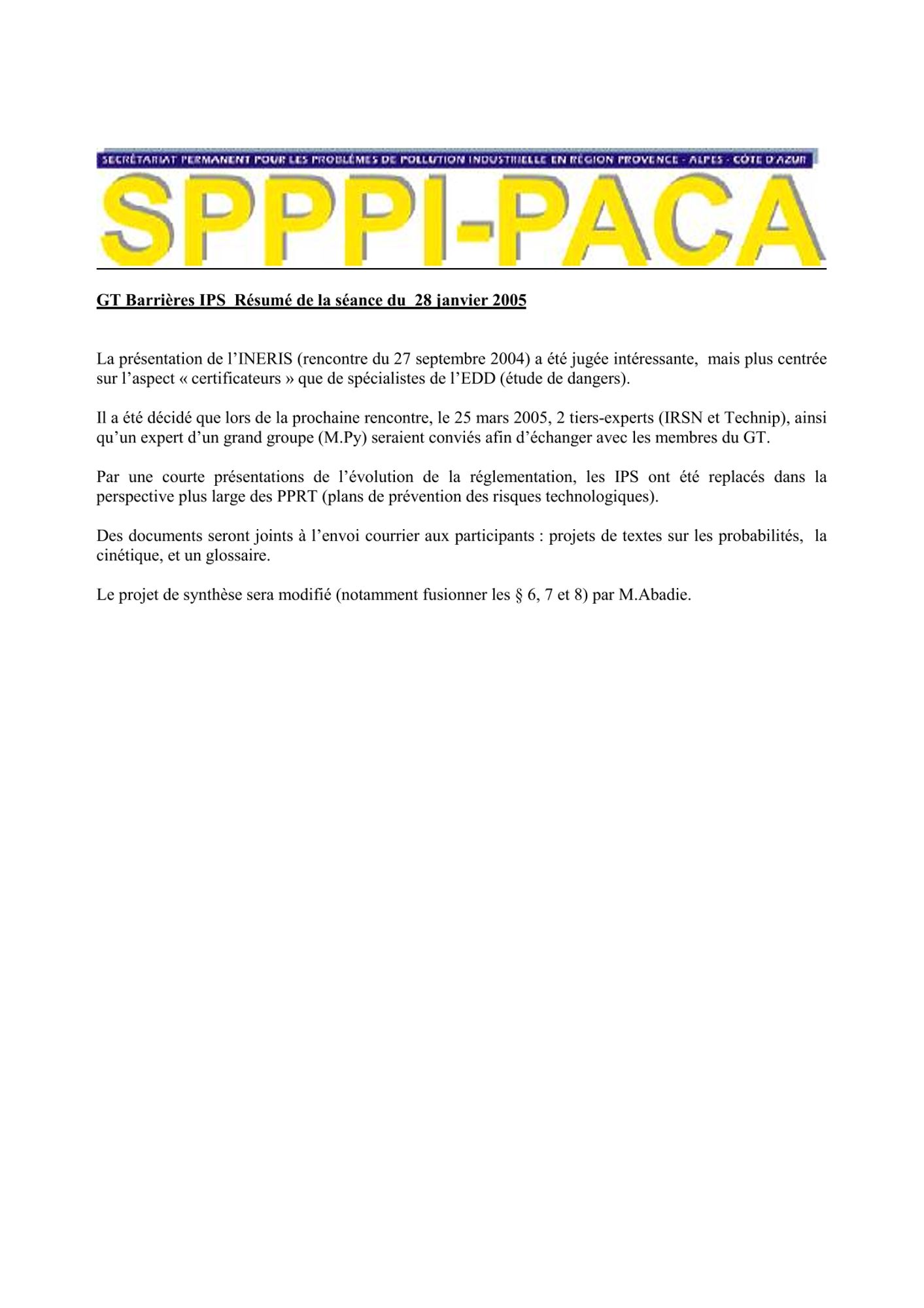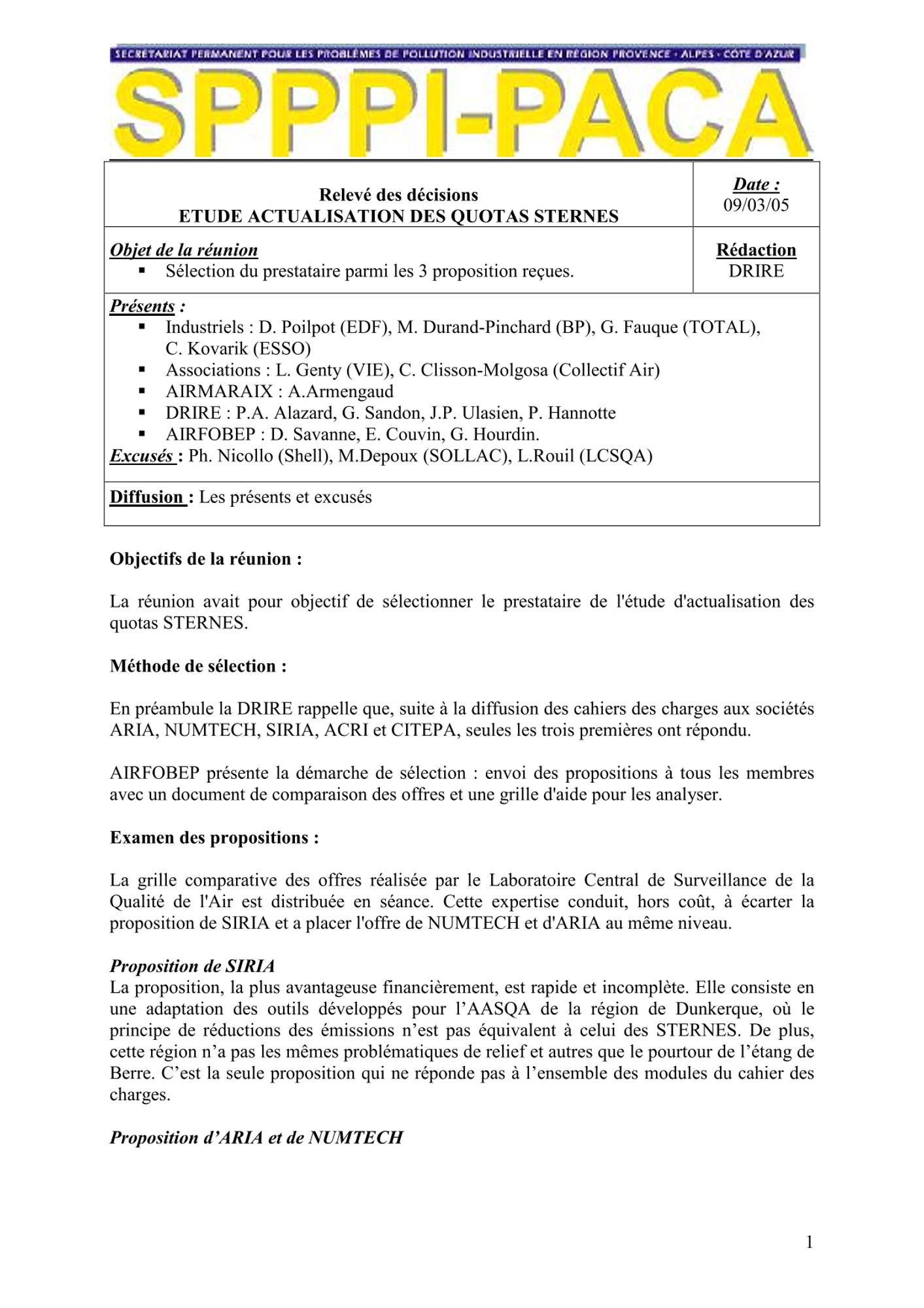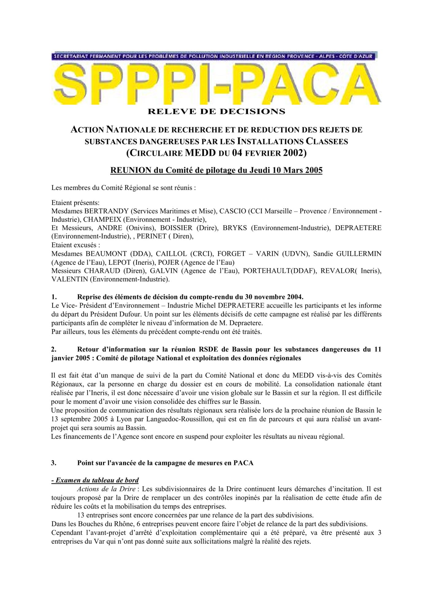 Comptes rendus et relevés de décision 2005 de janvier à mars CR et RD_Barrières et IPS_25/03/2005 (64.9 Ko) CR et RD_Etude actualisation des quotas sternes : lancement de l'étude_16/03/2005 (122.7 Ko) CR et RD_GT SPPPI Dioxines_14/03/2005 (91.6 Ko) CR et RD_Action Nationale de recherche et de réduction des rejets de substances dangereuses_10/03/2005 (161.8 Ko) CR et RD_Sélection du prestataire parmi les 3 propositions_09/03/2005 (131.7 Ko) CR et RD_GT REX_02/02/2005 (109.8 Ko) CR et RD_GT Barrières IPS : résumé de la séance_28/01/2005 (63.4 Ko) CR et RD_GT TMD veille statistique et économique_17/01/2005 (159.0 Ko)