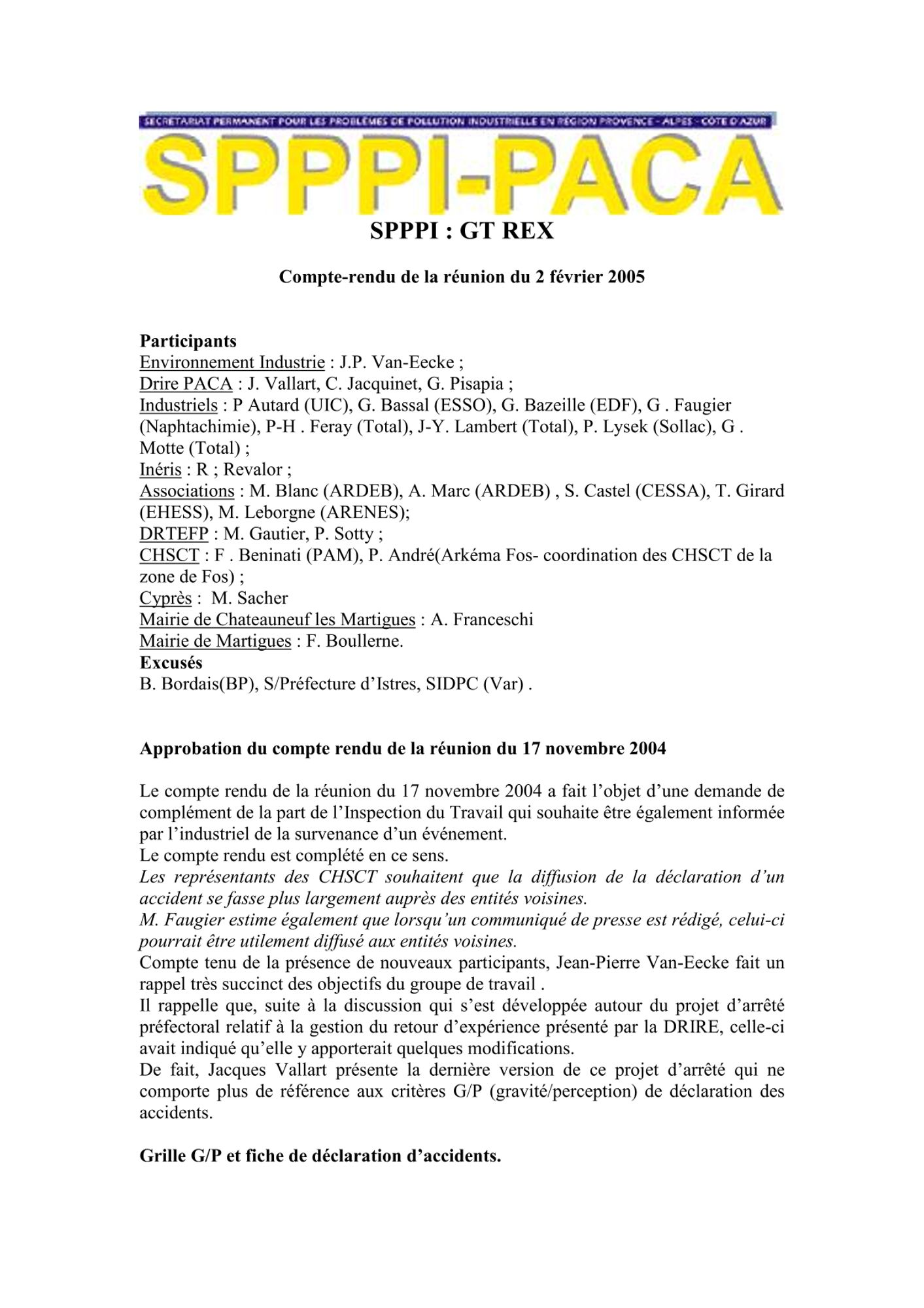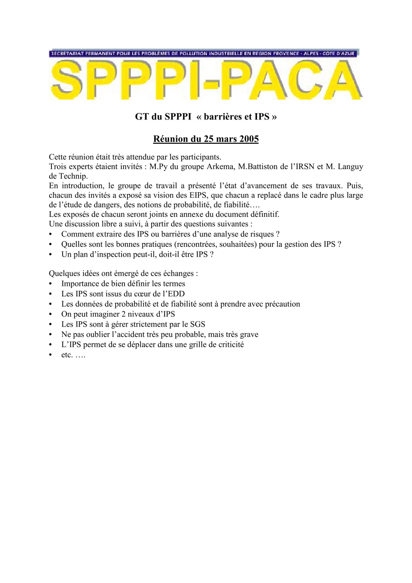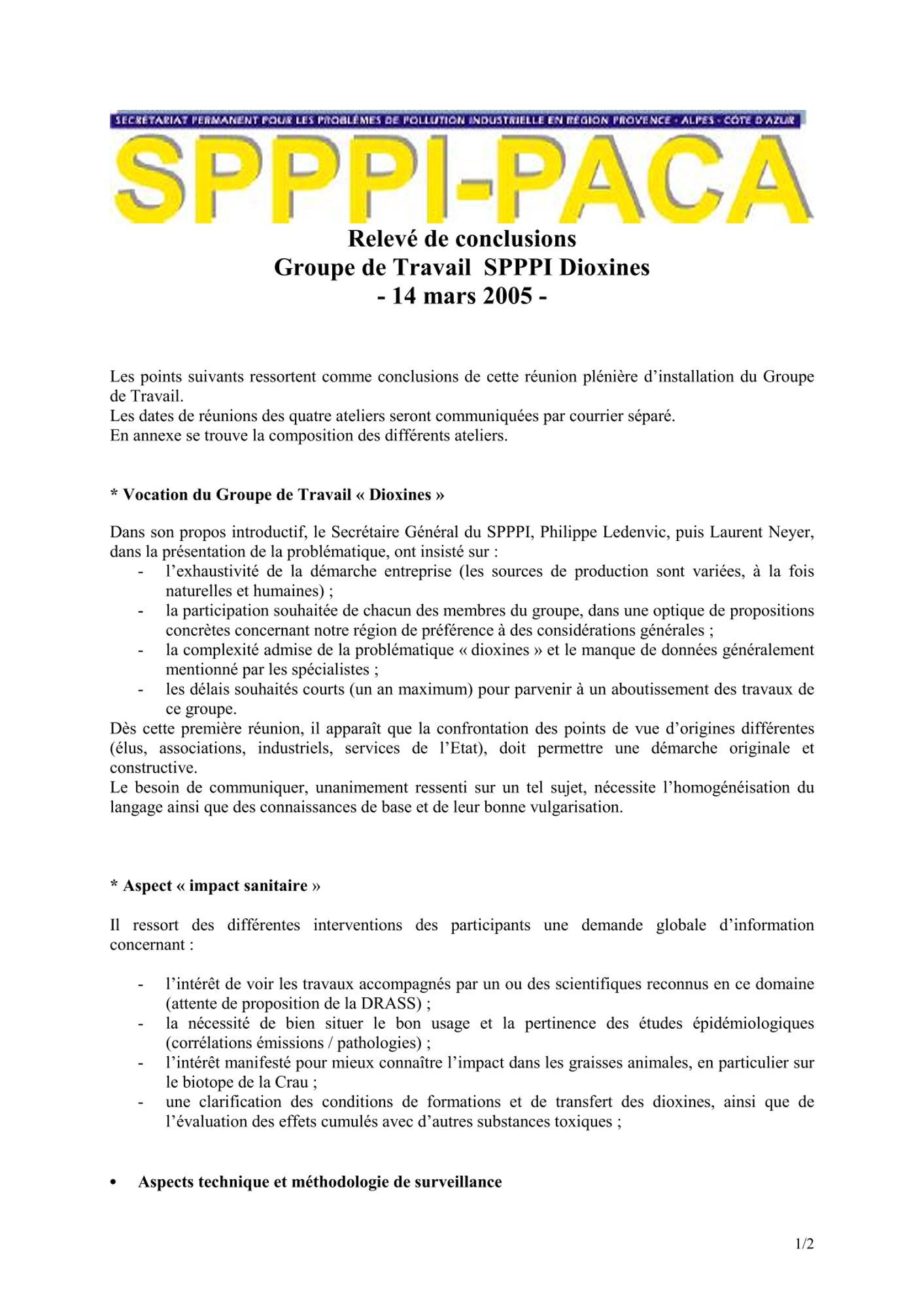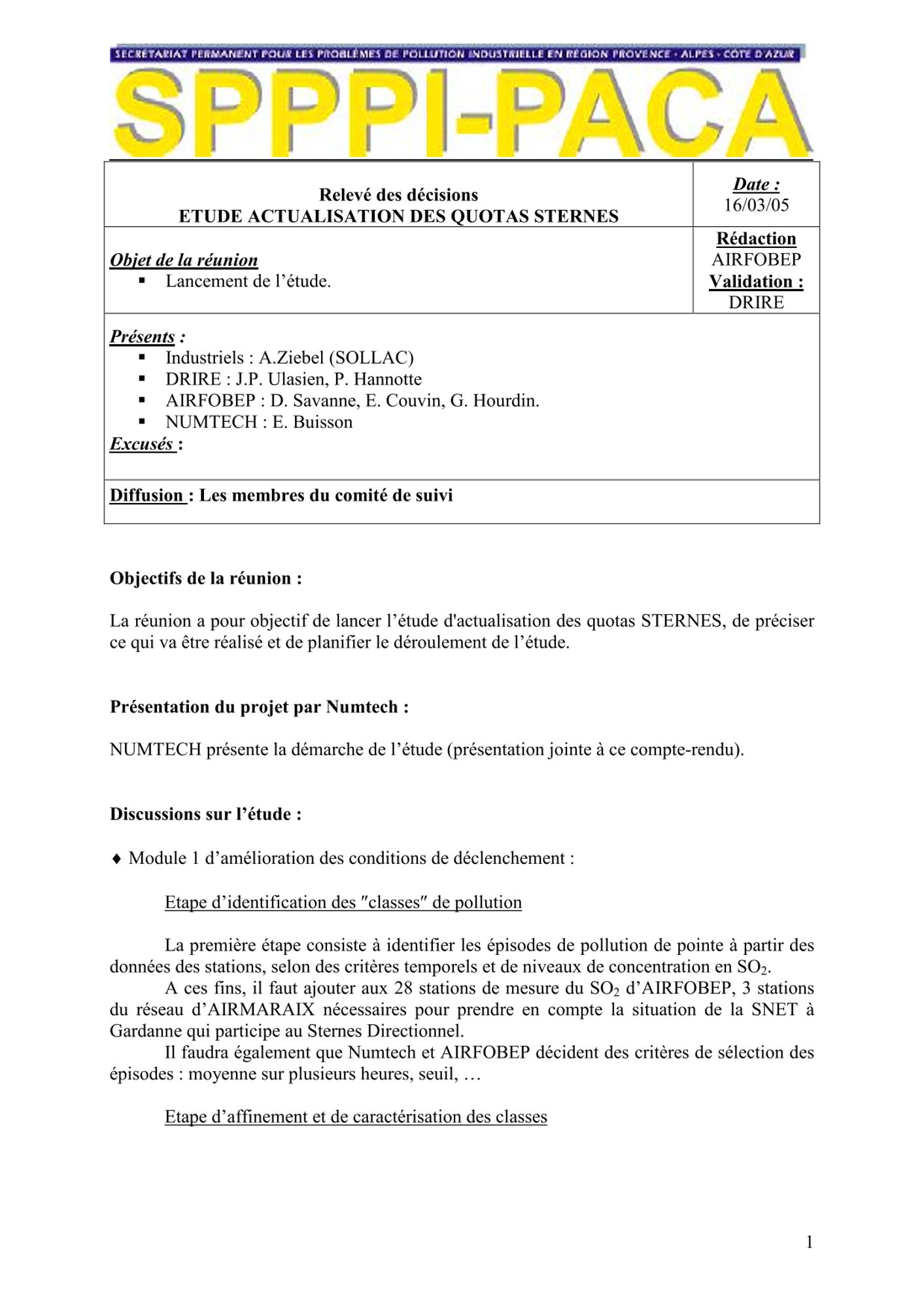 Comptes rendus et relevés de décision 2005 de janvier à mars CR et RD_Barrières et IPS_25/03/2005 (64.9 Ko) CR et RD_Etude actualisation des quotas sternes : lancement de l'étude_16/03/2005 (122.7 Ko) CR et RD_GT SPPPI Dioxines_14/03/2005 (91.6 Ko) CR et RD_Action Nationale de recherche et de réduction des rejets de substances dangereuses_10/03/2005 (161.8 Ko) CR et RD_Sélection du prestataire parmi les 3 propositions_09/03/2005 (131.7 Ko) CR et RD_GT REX_02/02/2005 (109.8 Ko) CR et RD_GT Barrières IPS : résumé de la séance_28/01/2005 (63.4 Ko) CR et RD_GT TMD veille statistique et économique_17/01/2005 (159.0 Ko)