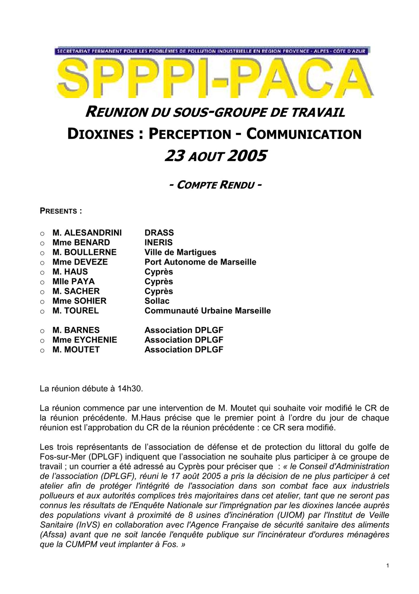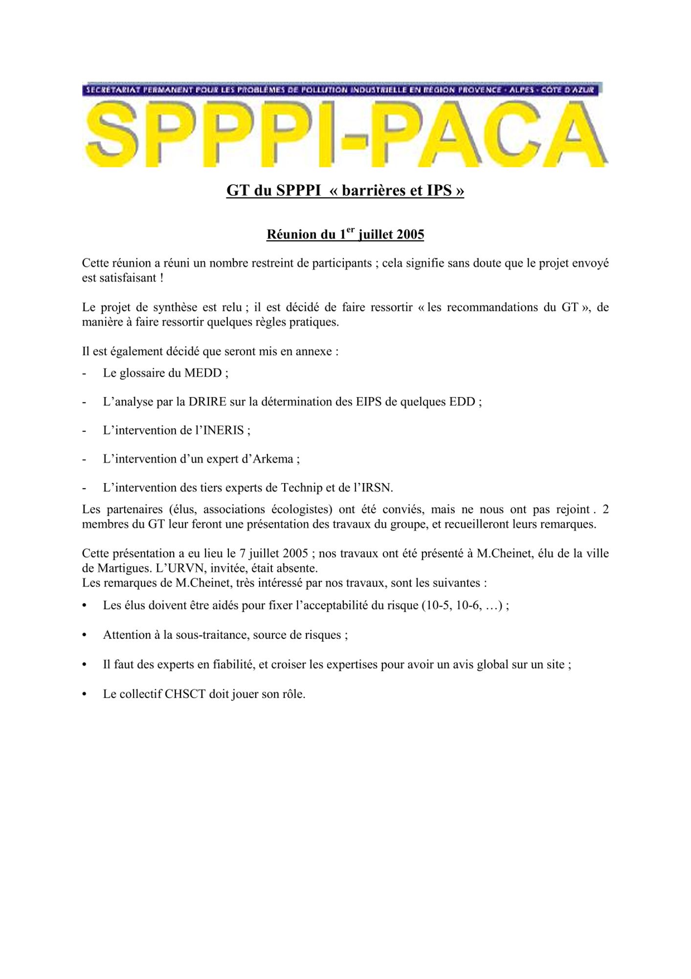 Comptes rendus et relevés de décision 2005 de juillet à décembre CR et RD_Dioxines et Méthodologie de surveillance_09/11/2005 (190.3 Ko) CR et RD_Dioxines : Perception - Communication_23/05/2005 (95.4 Ko) CR et RD_Barrières et IPS_01/07/2005 (65.9 Ko)
