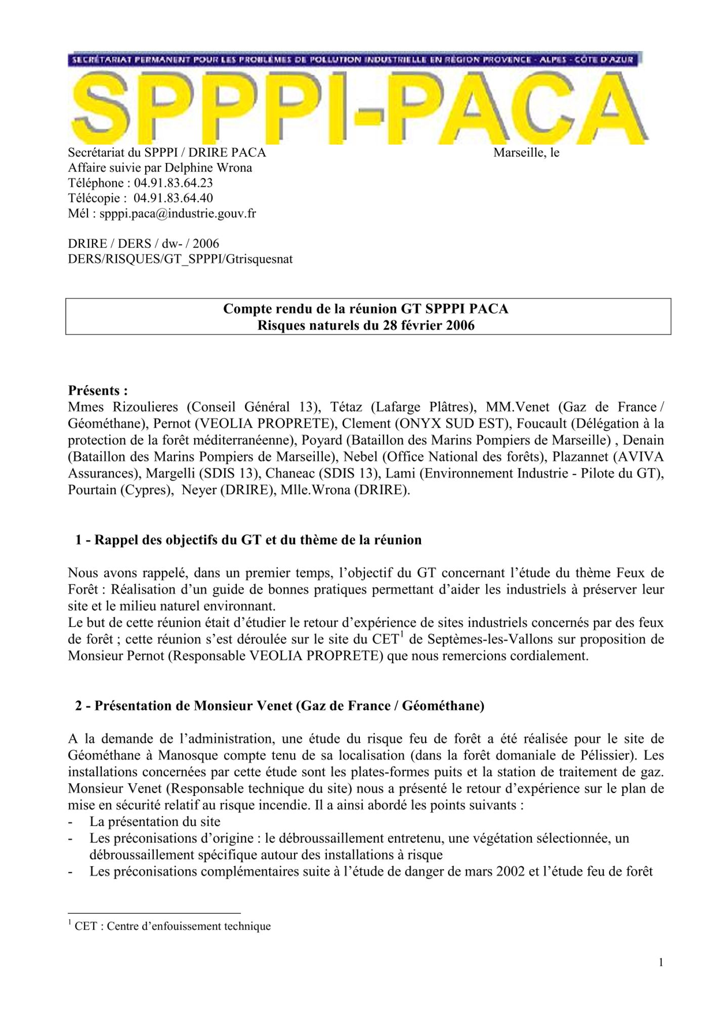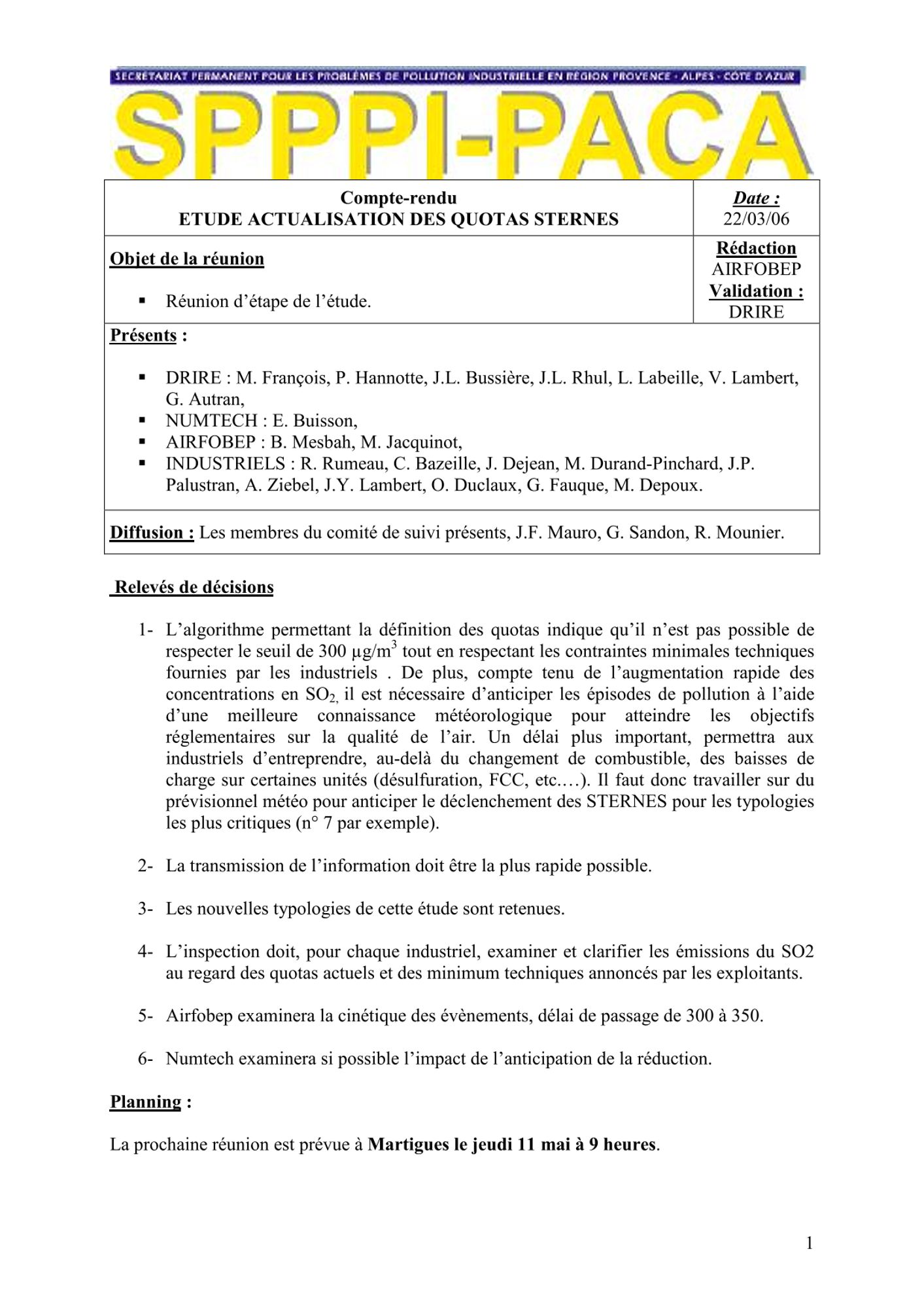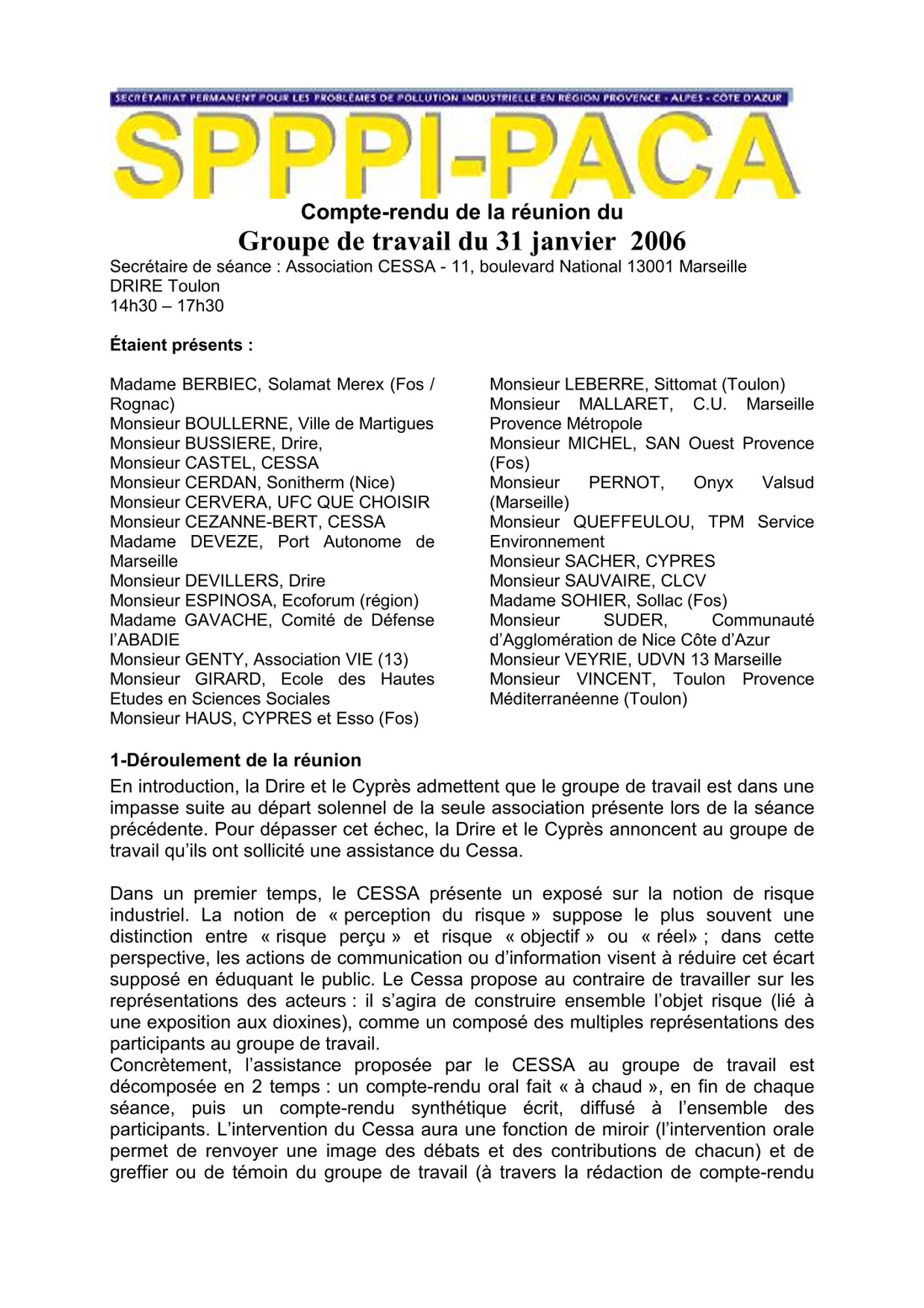 Comptes rendus et relevés de décision 2006 de janvier à mars CR et RD_Etude actualisation des quotas sternes_22/03/2006 (308.7 Ko) CR et RD_Réunion du SPPPI GT Dioxines_Atelier : Perception et Communication_21/03/2006 (84.7 Ko) CR et RD_Risques naturels_28/02/2006 (92.5 Ko) CR et RD_GT REX_15/02/2006 (82.8 Ko) CR et RD_Assistance du CESSA_31/01/2006_ (99.0 Ko) CR et RD_Méthodologie de surveillance_25/01/2006 (84.3 Ko) CR et RD_Risques naturels_17/01/2006 (88.5 Ko)