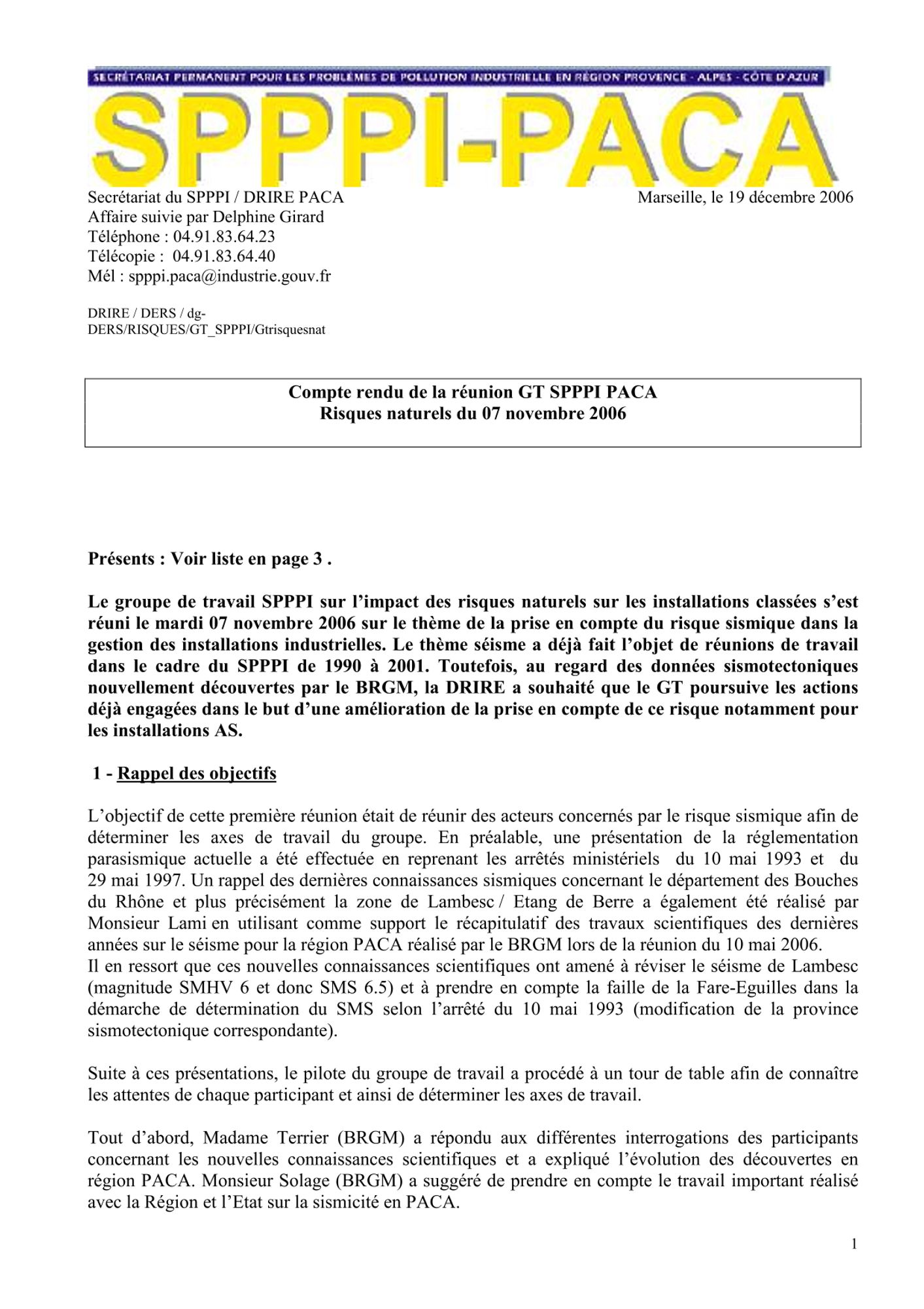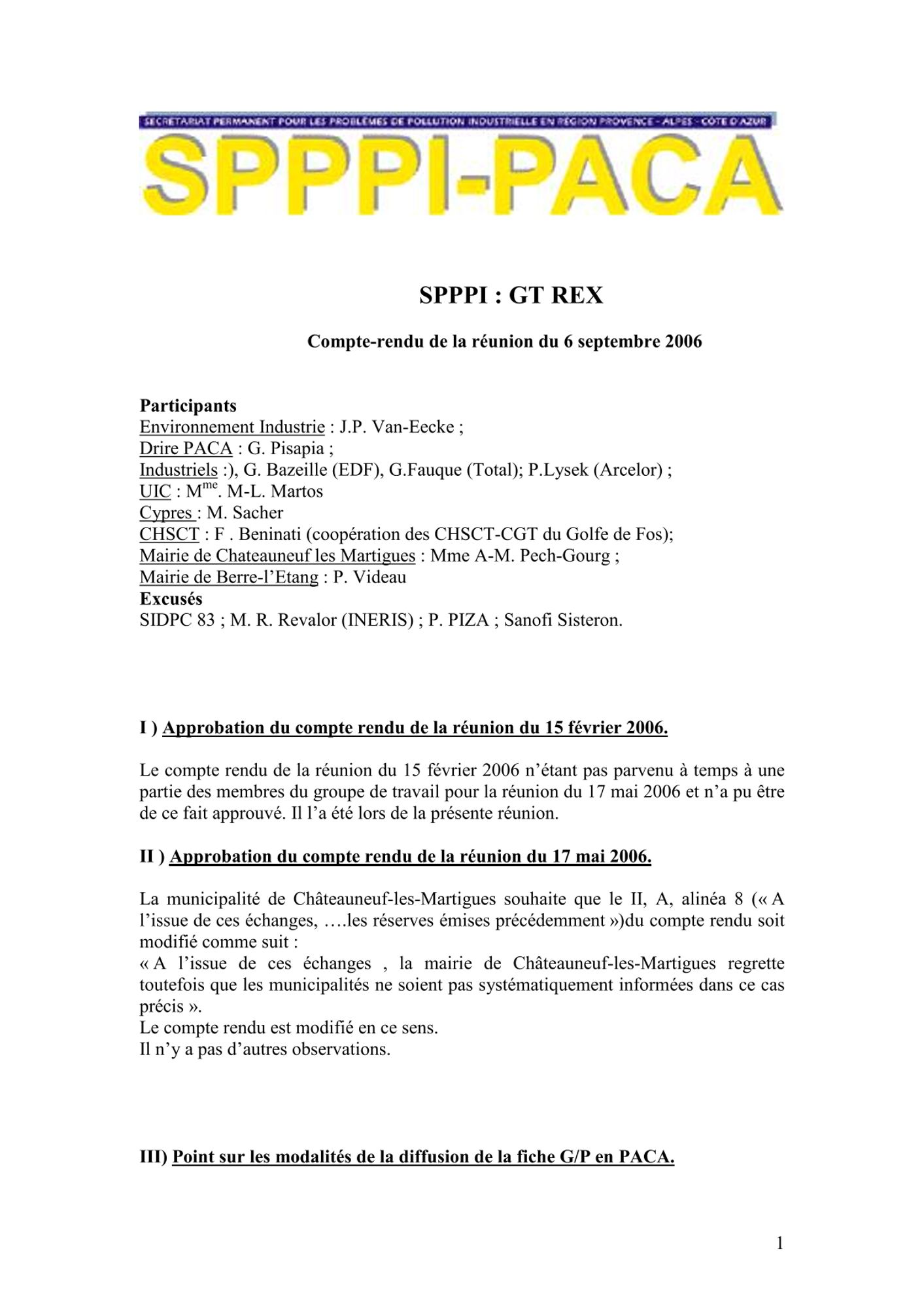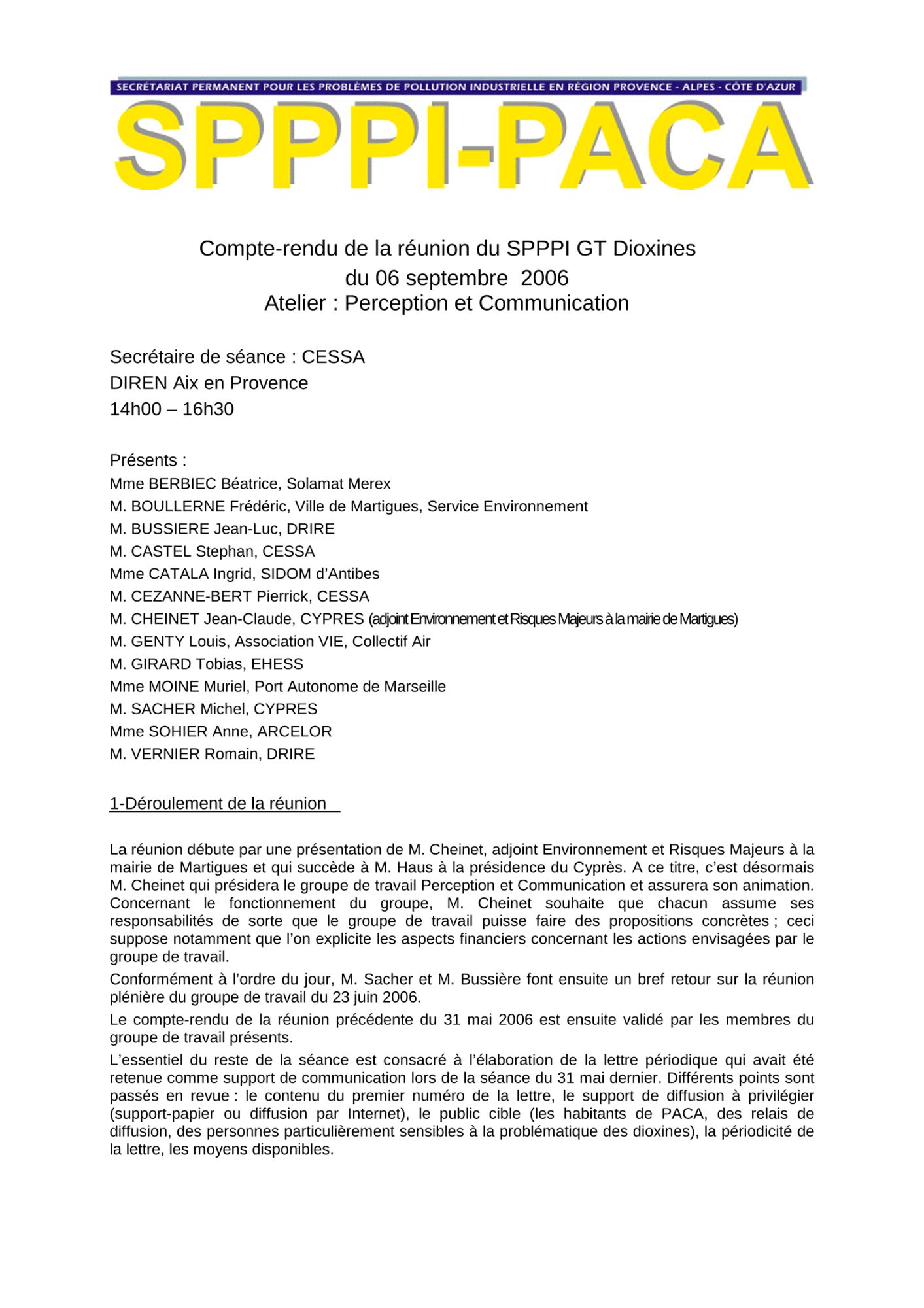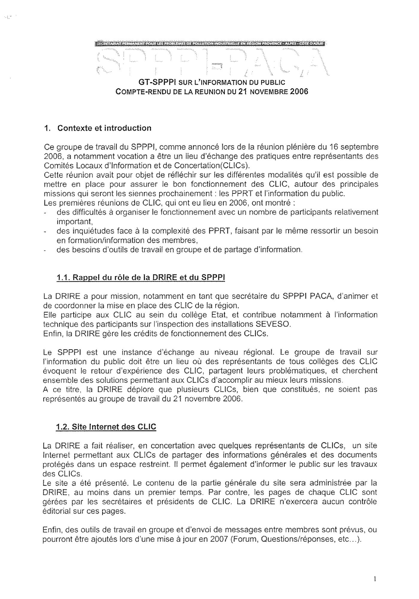 Comptes rendus et relevés de décision 2006 de septembre à novembre CR et RD_Mettre en place les modalités pour assurer le bon fonctionnement des CLIC_21/11/2006 (124.2 Ko) CR et RD_Prise en compte des risques sismique dans la gestion des installations industrielles_07/11/2006 (141.8 Ko) CR et RD_Compte Rendu du SPPPI GT Dioxines_Atelier "Perception et Communication"_20/10/2006 (40.8 Ko) CR et RD_Compte rendu de la réunion GT REX_06/09/2006 (90.8 Ko) CR et RD_GT Dioxines_Atelier "Perception et Communication"_06/09/2006 (36.0 Ko)