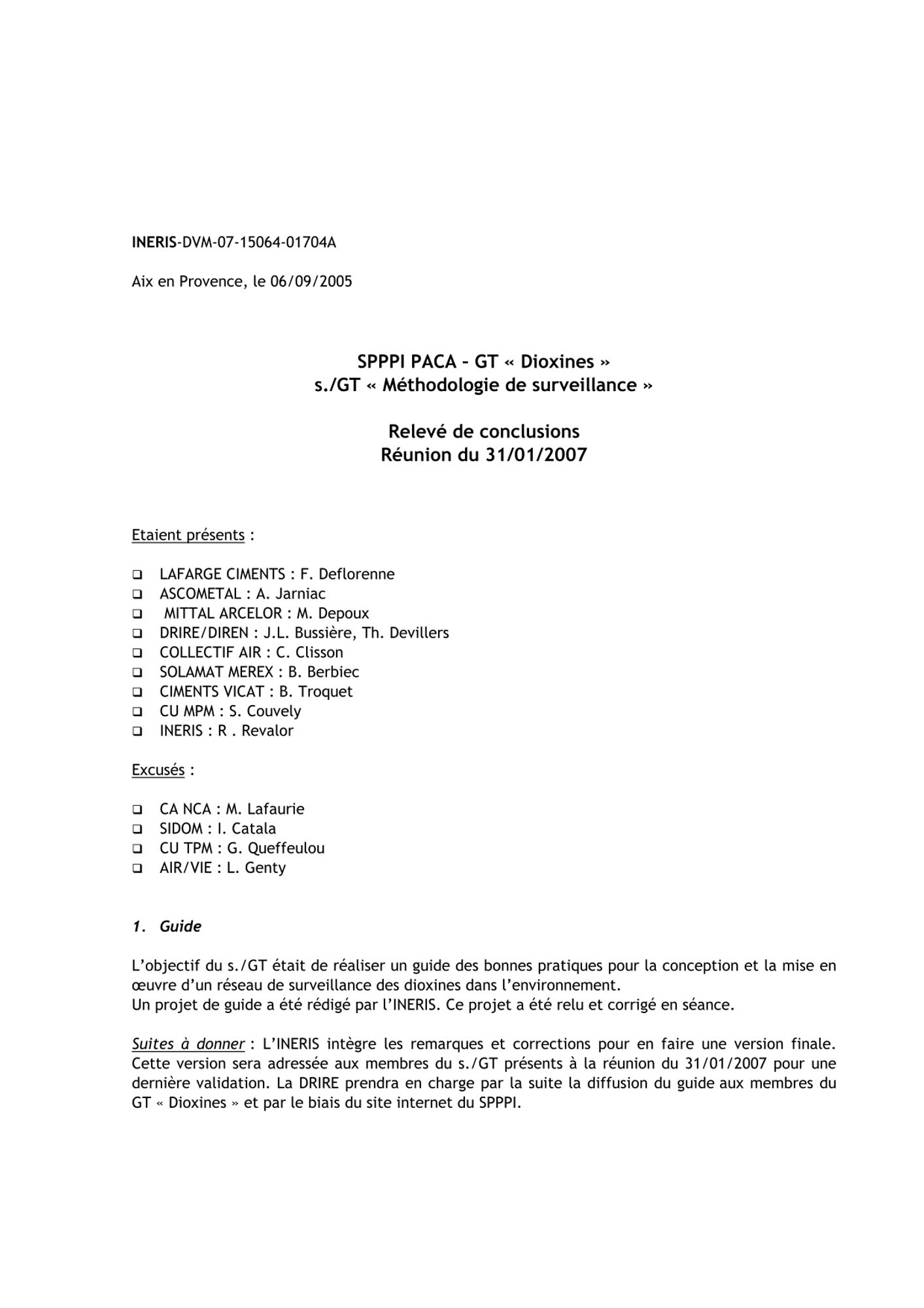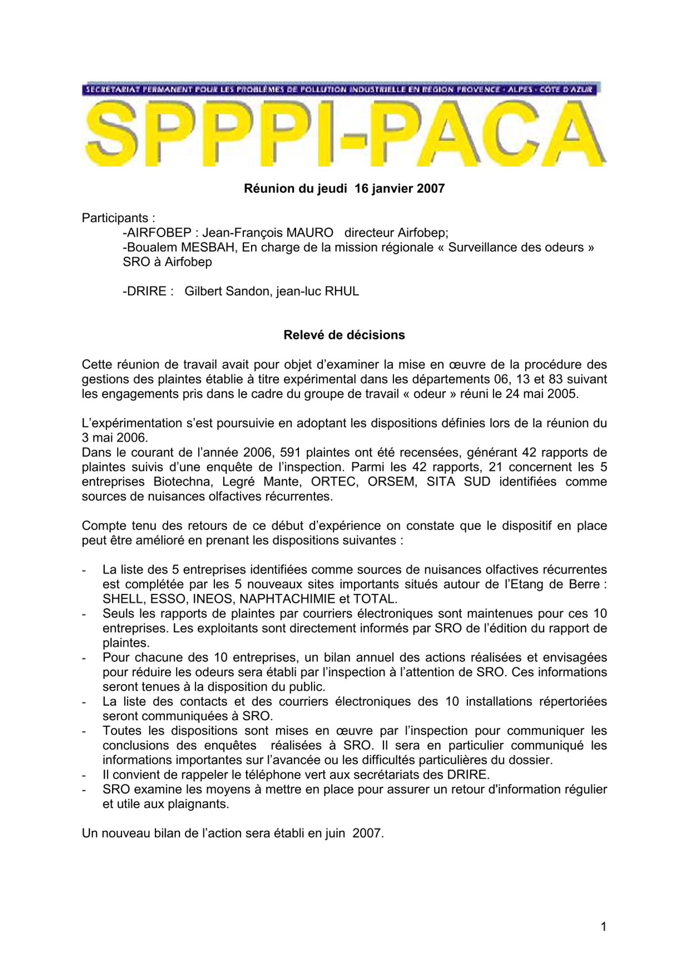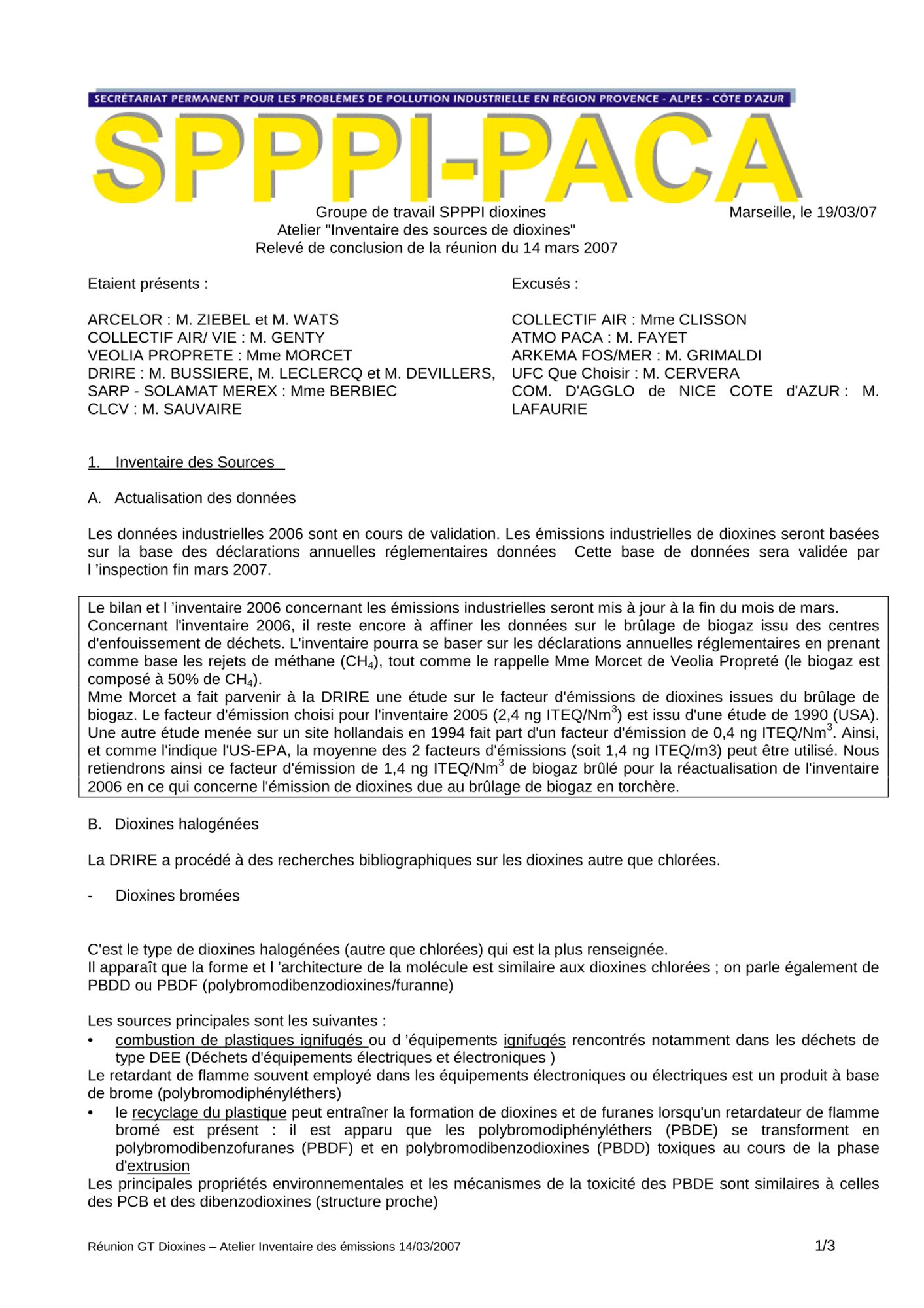 Comptes rendus et relevés de décision 2007 CR et RD_Prise en compte du risque sismique dans la gestion des installations industrielles_17/04/2007 (135.8 Ko) CR et RD_Groupe de travail SPPPI dioxines "Inventaire des sources de dioxines"_14/03/2007 (37.4 Ko) CR et RD_Relevé de conclusions "dioxines" - "méthodologie de surveillance"_31/01/2007 (51.6 Ko) CR et RD_Mise oeuvre de la procédure des gestions des plaintes_16/01/2007 (64.4 Ko)