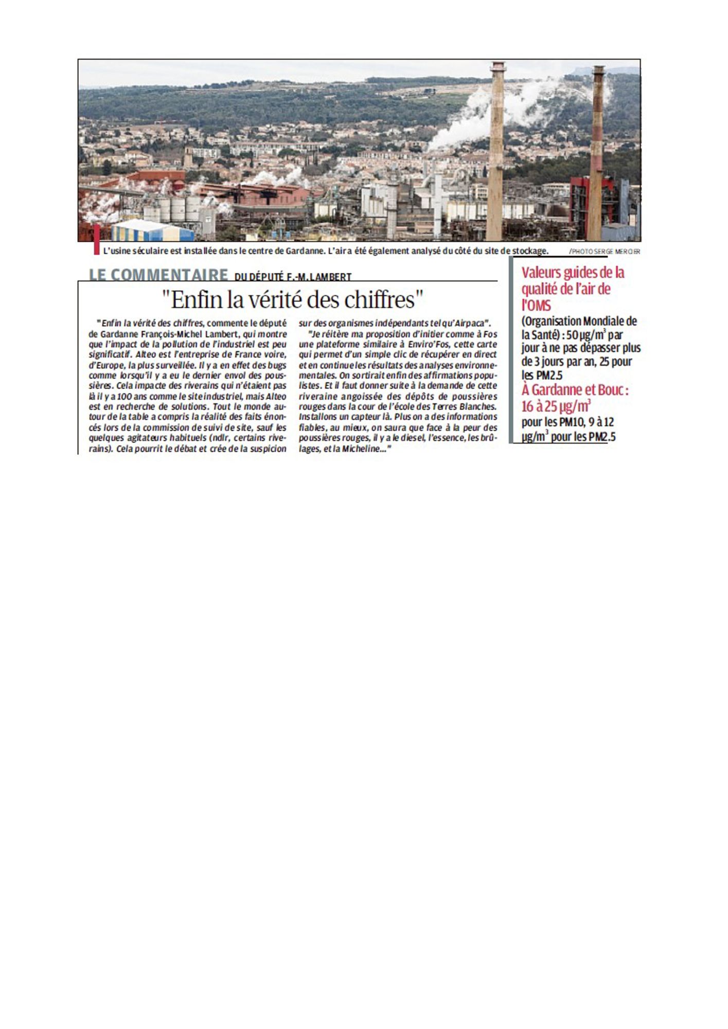 Je réitère ma proposition d'initier comme à Fos une plateforme similaire à Enviro'Fos, cette carte qui permet d'un simple clic de récupérer en direct et en continue les résultats des analyses environnementales.