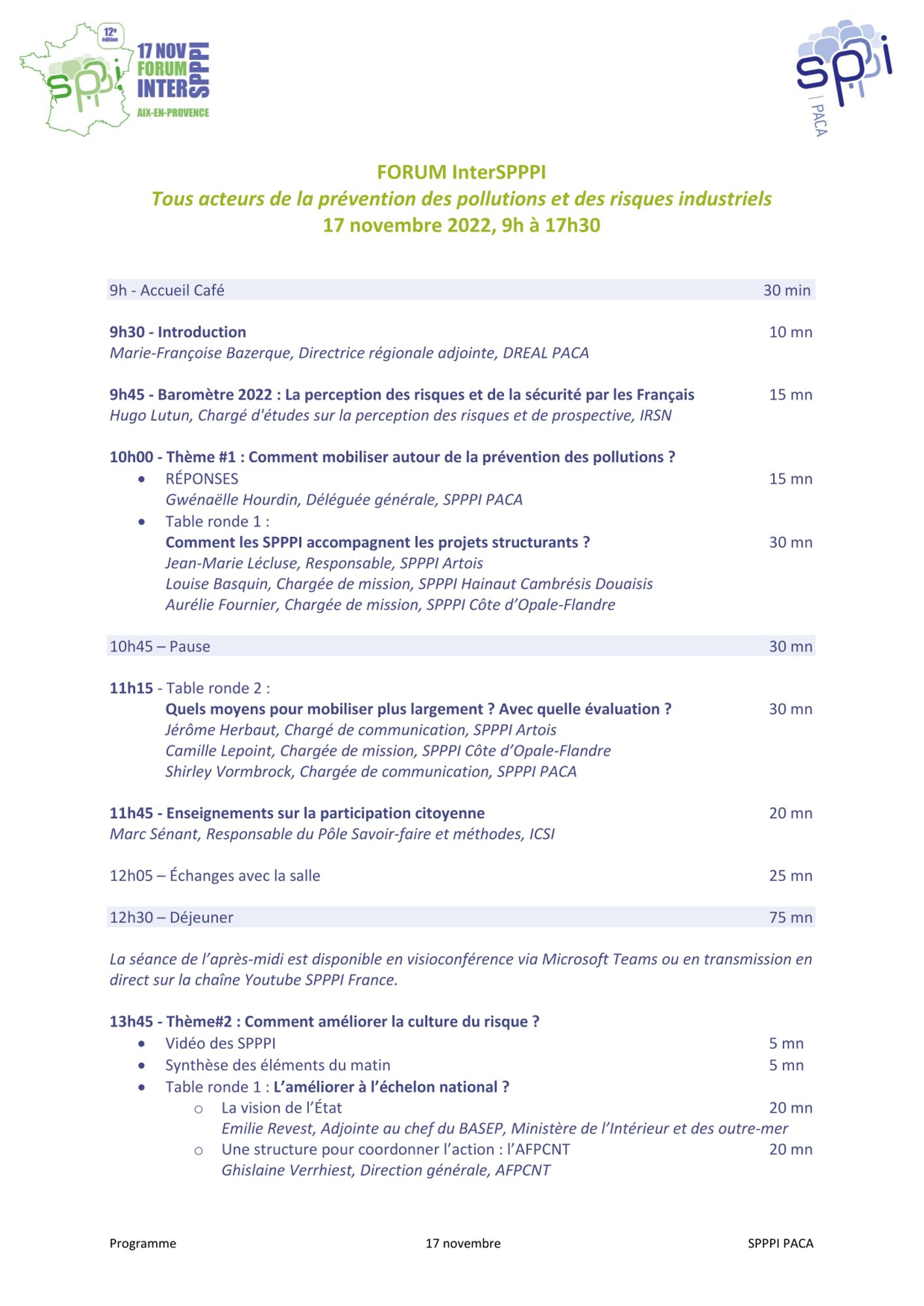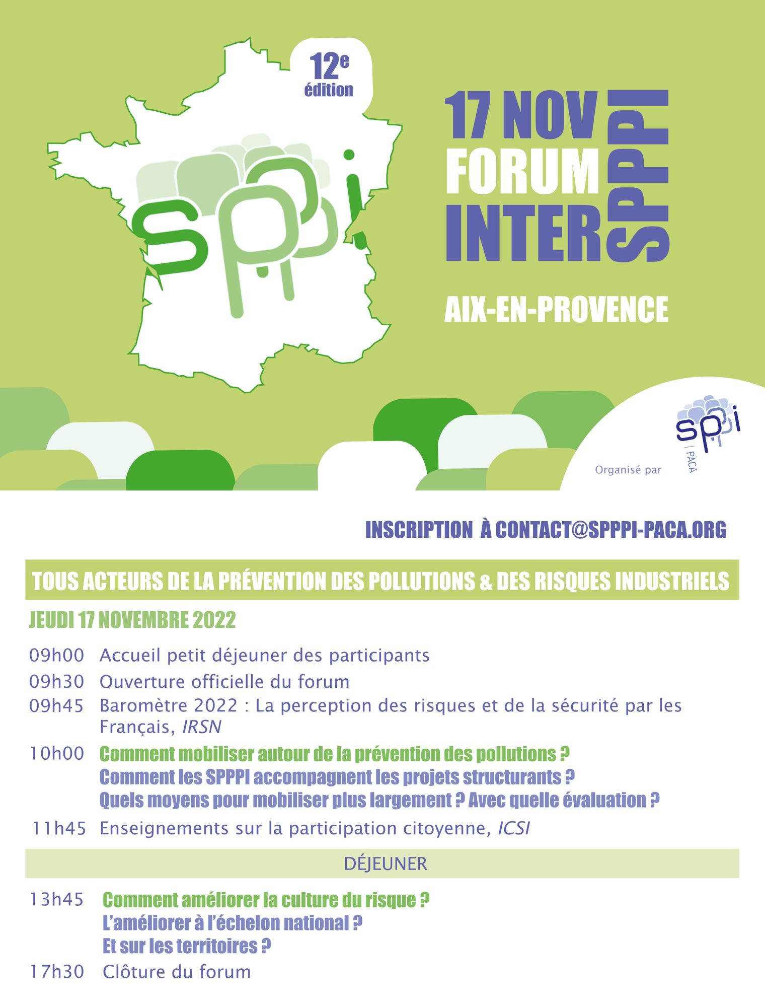 Afin de partager et de développer les bonnes pratiques et les résultats obtenus, les SPPPI (Secrétariats permanents pour la prévention des pollutions et des risques) organisent tous les 2 ans un Forum national inter-SPPPI, ouvert à l’ensemble des membres des différents SPPPI de France.